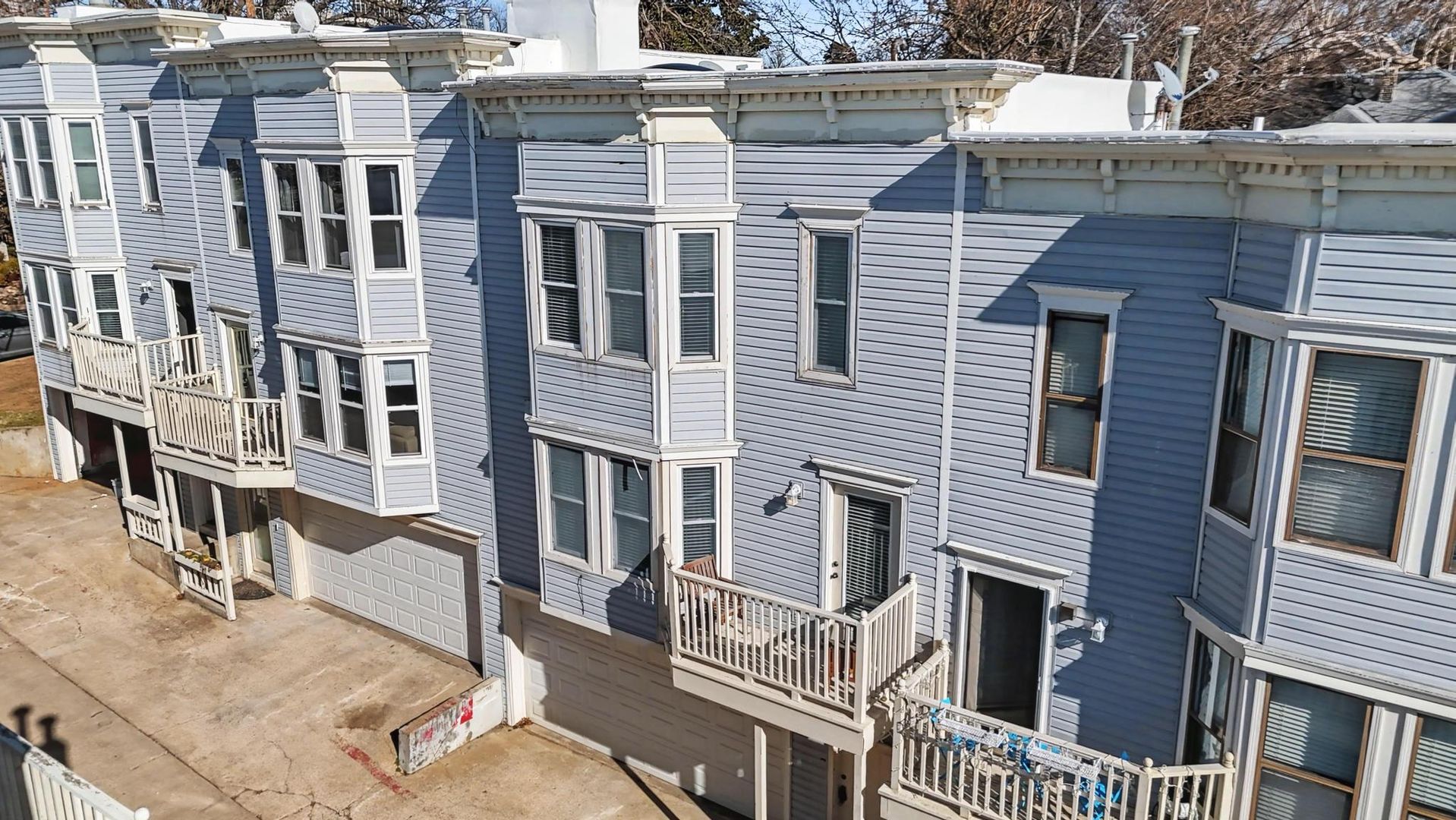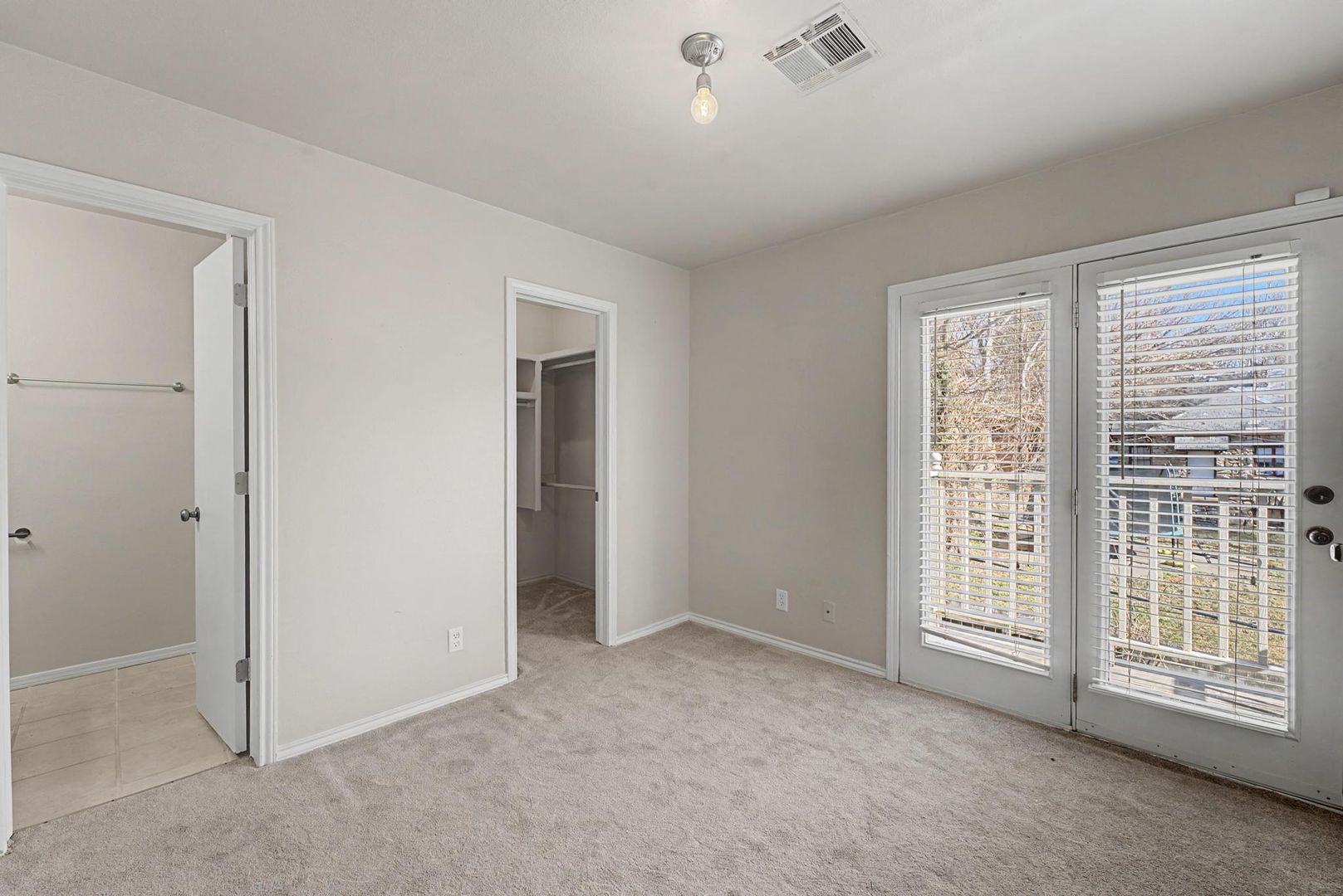 Primary suite offers vaulted ceilings, bay windows, and a skylight. Second bedroom includes a walk-in closet and private deck. Attached 2-car garage with additional storage.